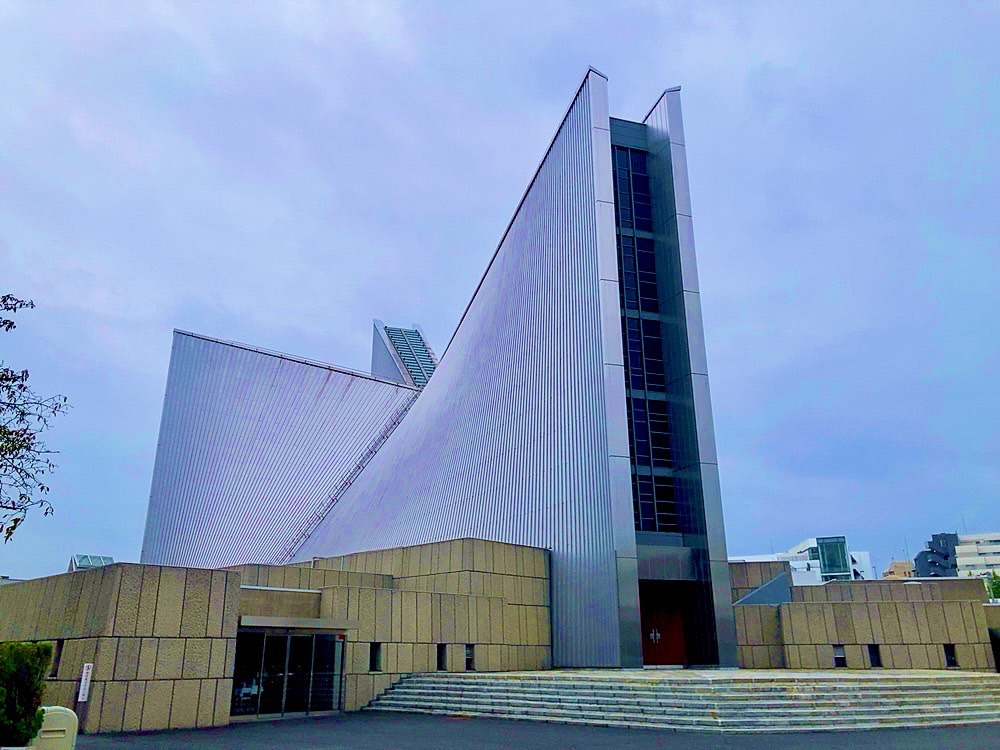空に伸びるような特徴的な造形と、ステンレス・スチール張りの外観で、圧倒的な存在感を放つ日本最大級の教会です。