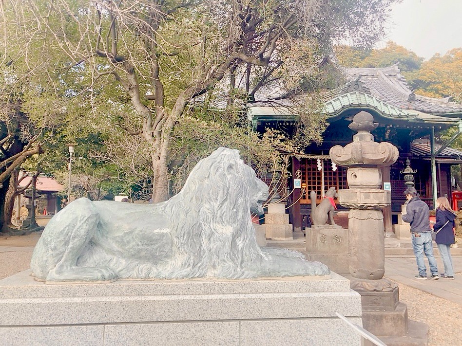 三井の「井」の字を四角でかこんだ「囲」の字であることから三井(三越)グループとの縁が深く、境内には見覚えのあるライオン像が鎮座します。