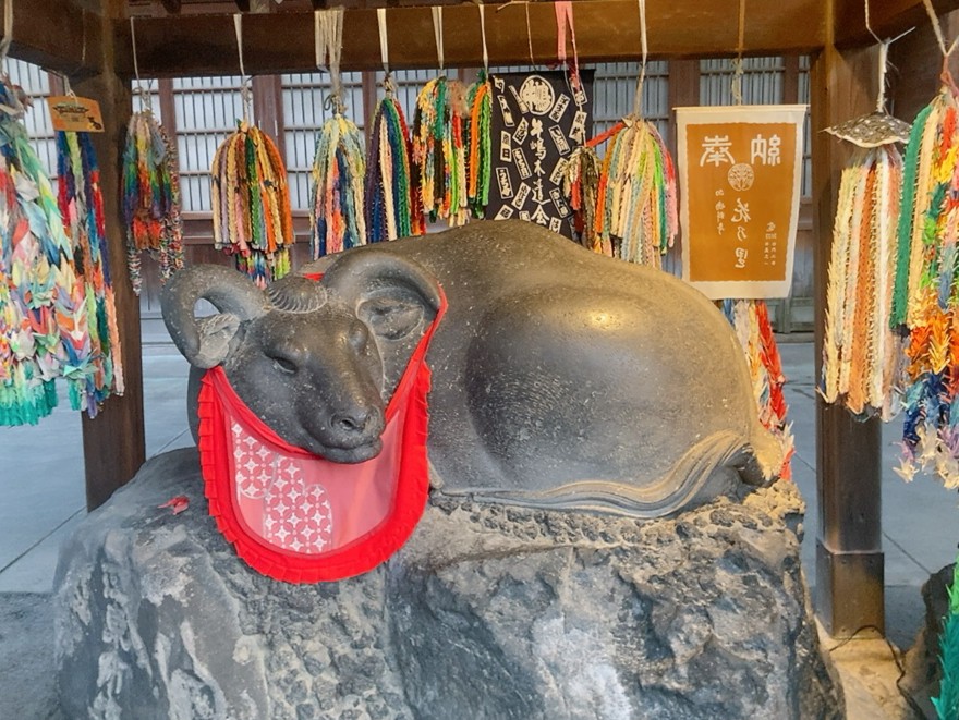 「撫で牛」は自分の身体の悪い部分と牛の同じ部分を撫でると病と心までもが治ると言われ、病気治癒のために参拝する人が多いそうです。