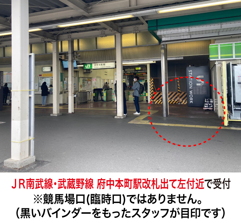 JR南武線・武蔵野線 府中本町駅改札出て左付近 ※競馬場口(臨時口)ではありません。 (黒いバインダーを持ったスタッフを配置します) |