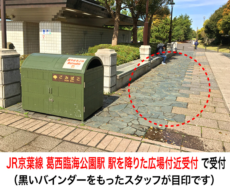 JR京葉線 葛西臨海公園駅 駅を降りた広場付近受付 (黒いバインダーを持ったスタッフを配置します) |