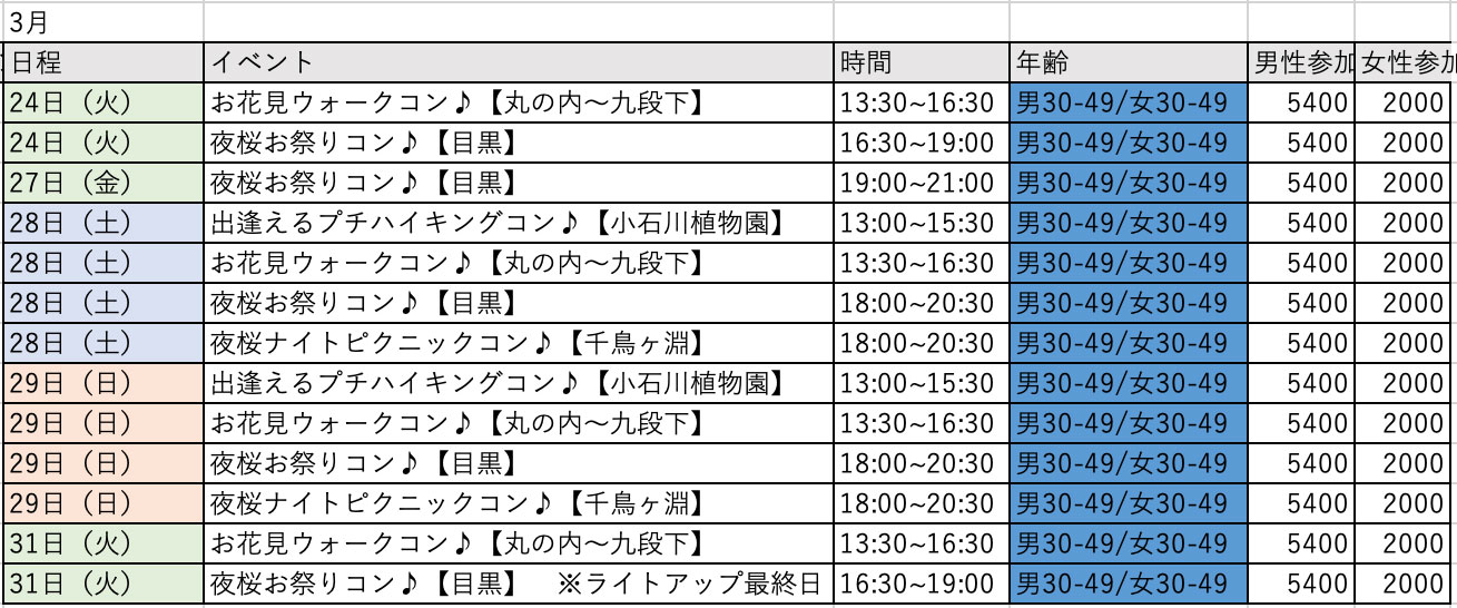 | ●3月21日(土)18:00〜20:45 女性急募!期間限定!桜舞う春のプロジェクションマッピング♡夜桜×キャンドル×360度夜景の幻想的コラボレーション★全員と1対1トークあり♪大人のナイトデートコン♪【浜松町】6対6 対象年齢| 男性:30-49歳 女性:30-49歳応募状況| 男性:残り半分 女性:受付可能 参加費用| 男性:5,400円 女性:2,000円 ※LINE@登録で早割1000円引き♪前日割500円引き♪さらにクーポンが付いてお得♪ ![]() |